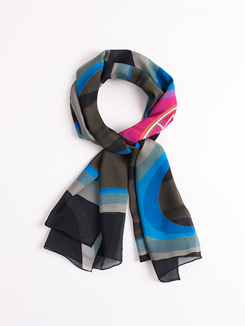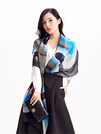将花窗明月的意境映然与水波游动当中,展现苏式庭院的意象之美。水墨质感中点缀蓝色的水波与花窗明月,悠然惬意,将一幅苏式美景印于丝巾之上。