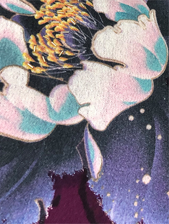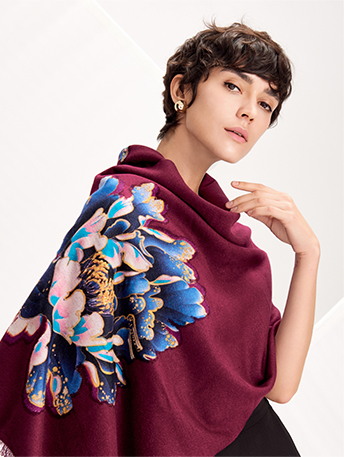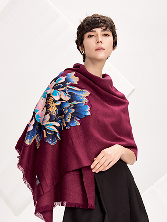 作品以牡丹花为纹样,加以漳绒剪花的工艺和纯手工缝珠绣法,精致的点缀了蚕丝厚织围巾。搭配各种服饰都能凸显优雅与沉稳气质,在秋冬给人以温暖之感。