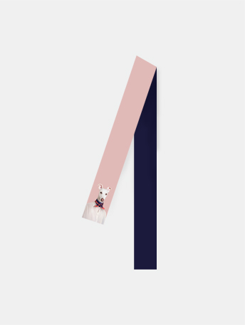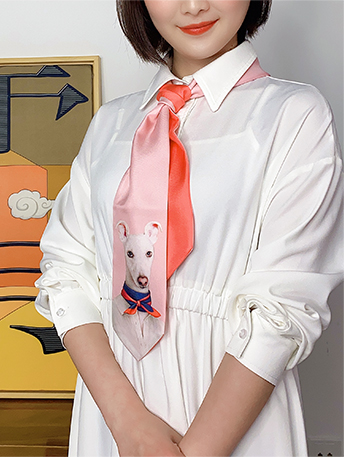 作品将格力犬卡通化拟人化,配以百分百蚕丝材质制作成窄巾,一面印花一面纯色,简洁百搭,而且男女通用。
